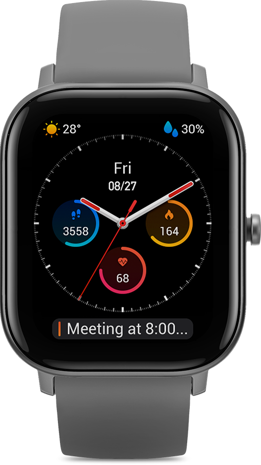 The customized 1.65-inch stylish square screen offers a larger display area than a round watch face of the same width, so it can carry more information. Additionally, we have released two innovative modular watch faces that can be customized to display essential information such as the heart rate, calendar, weather and events you care about the most, all in one watch face that's easy to check. In total, you can customize up to 7 widgets out of 17 functions.
