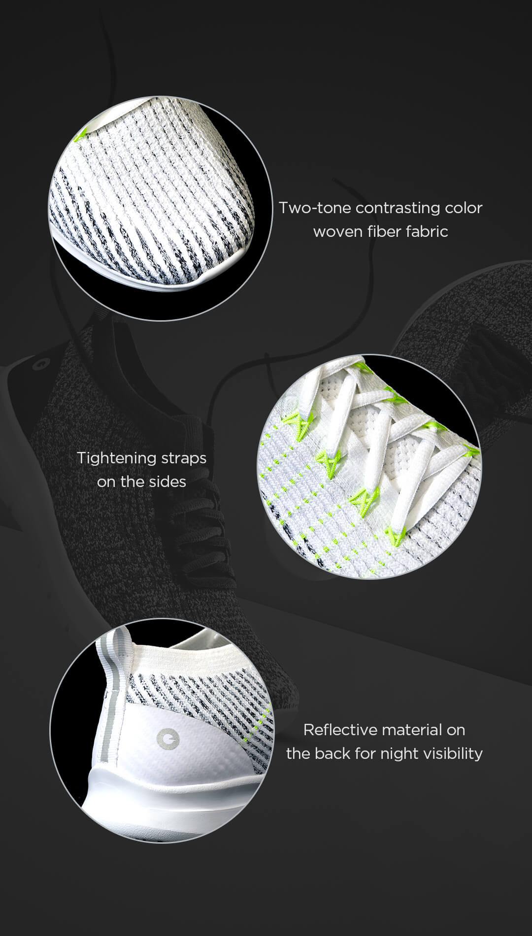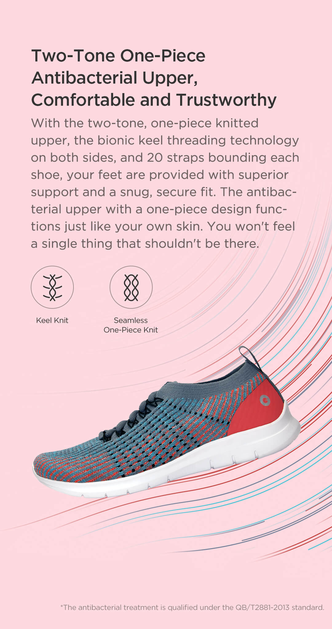 With the two-tone, one-piece knitted upper, the bionic keel threading technology on both sides, and 20 straps bounding each shoe, your feet are provided with superior support and a snug, secure fit. The antibacterial upper with a one-piece design functions just like your own skin. You won't feel a single thing that shouldn't be there.