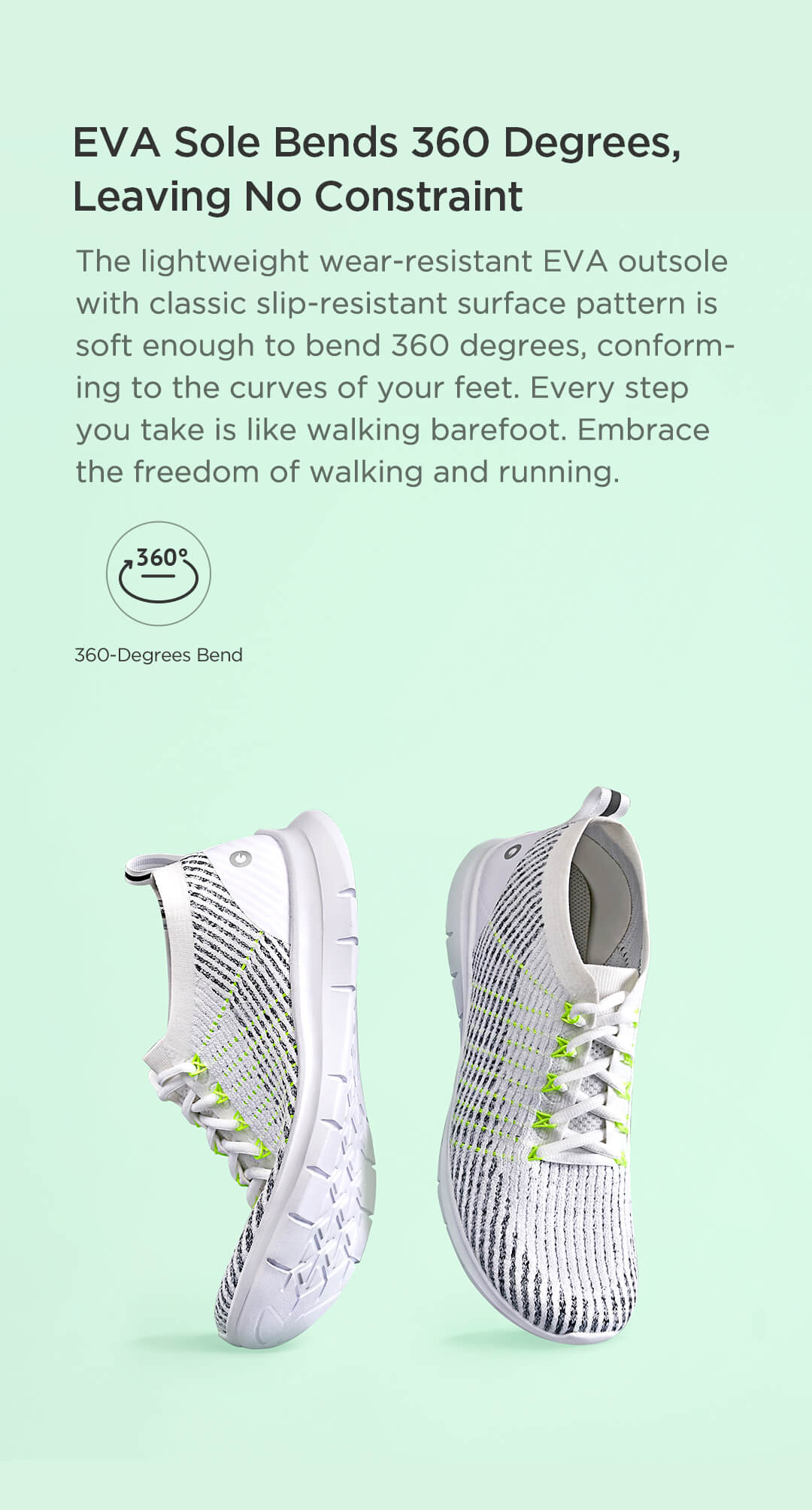 The lightweight wear-resistant EVA outsole with classic slip-resistant surface pattern is soft enough to bend 360 degrees, conforming to the curves of your feet. Every step you take is like walking barefoot. Embrace the freedom of walking and running.