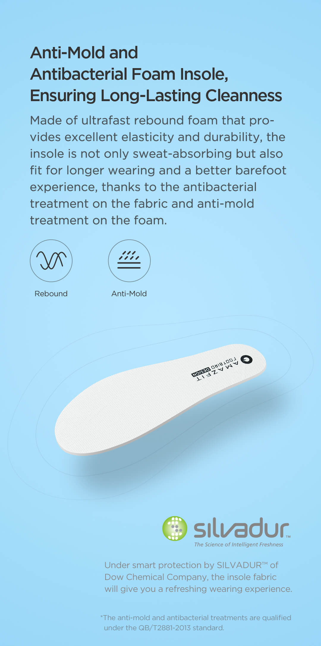 Made of ultrafast rebound foam that provides excellent elasticity and durability, the insole is not only sweat-absorbing but also fits for longer wearing and a better barefoot experience, thanks to the antibacterial treatment on the fabric and anti-mold treatment on the foam.