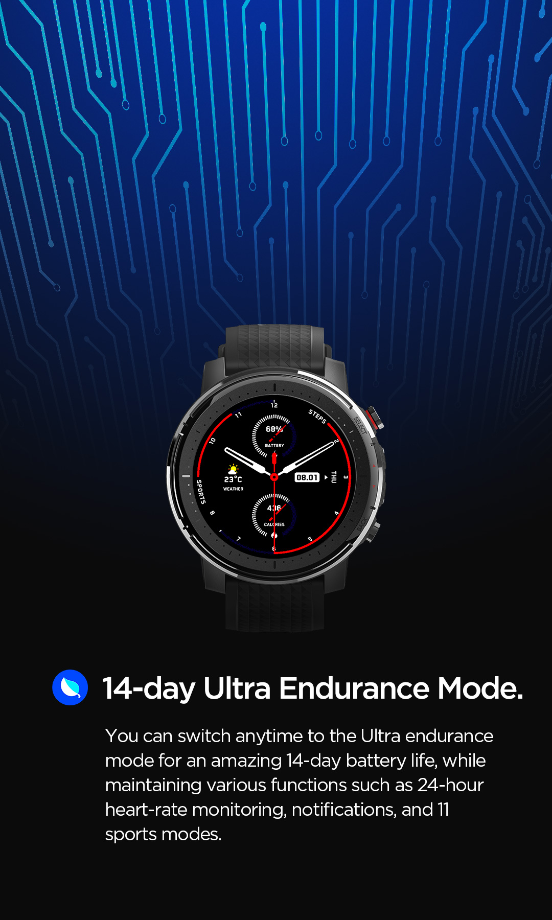 You can switch anytime to the Ultra endurance mode for an amazing 14-day battery life, while maintaining various functions such as 24-hour heart-rate monitoring, notifications, and 11 sports modes.