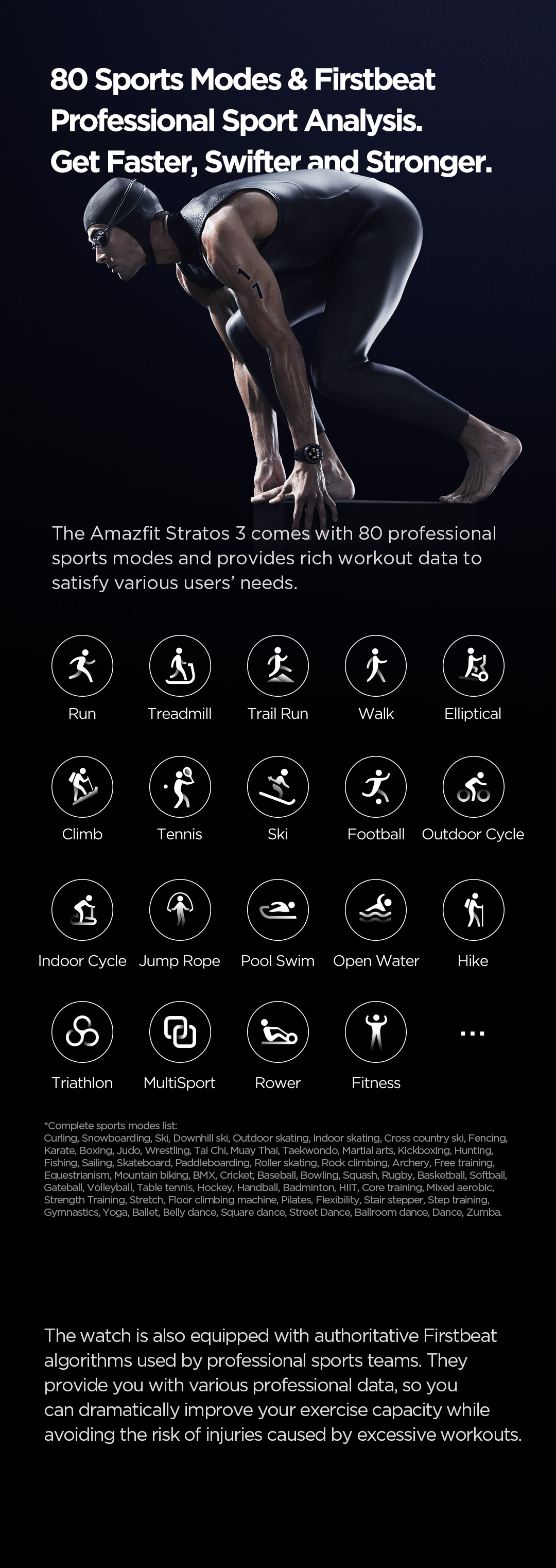 The Amazfit Stratos 3 comes with 80 professional sports modes and provides rich workout data to satisfy various users’ needs.