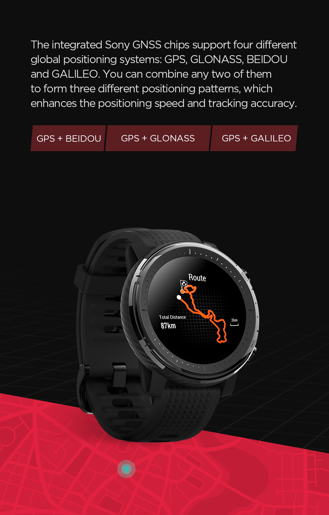 Huami Technology's proprietary BioTrackerTM PPG bio-tracking optical sensor brings heart-rate monitoring accuracy to a new level, which is comparable to the accuracy of sports heart rate bands. In addition to the 24-hour heart-rate monitoring, it provides warnings on excessively high heart rate and heart rate interval values. The integrated Sony GNSS chips support four different global positioning systems: GPS, GLONASS, BEIDOU and GALILEO. You can combine any two of them to form three different positioning patterns, which enhances the positioning speed and tracking accuracy.