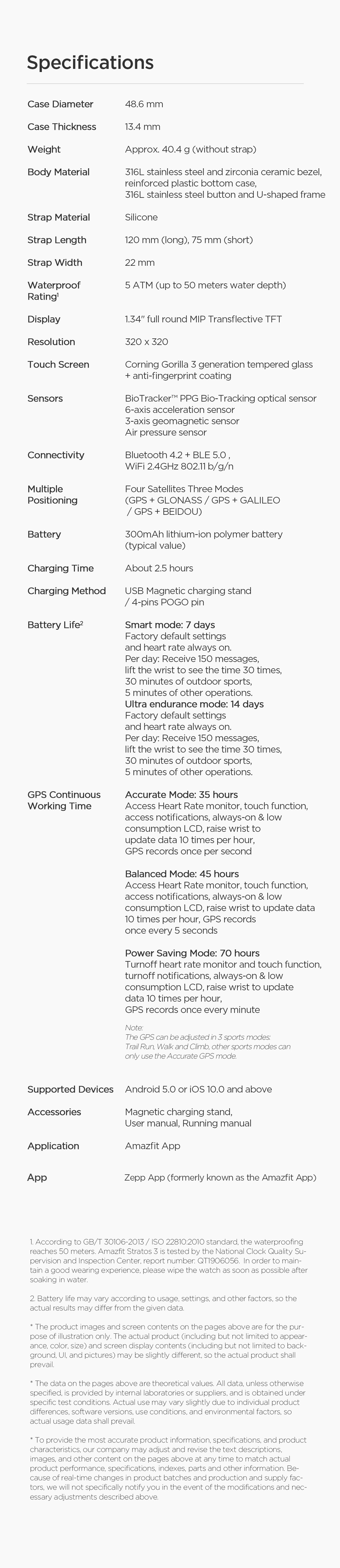 1. According to GB/T 30106-2013 / ISO 22810:2010 standard, the waterproofing reaches 50 meters. Amazfit Stratos 3 is tested by the National Clock Quality Supervision and Inspection Center, report number: QT1906056.