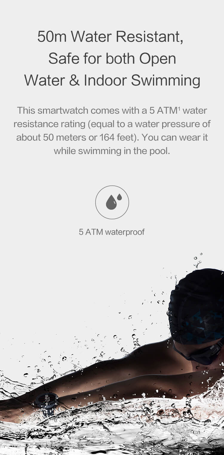 This smartwatch comes with a 5 ATM1 water resistance rating (equal to a water pressure of approximately 50 meters or 164