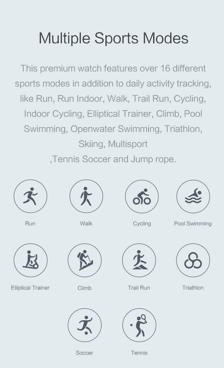 This premium watch features 16 different sports modes in addition to tracking for daily activities: Run, Run Indoors, Walk, Trail Run, Cycling, Indoor Cycling, Elliptical Trainer, Climbing, Pool Swimming, Open-Water Swimming, Triathlon, Skiing, Multisport, Tennis, Soccer and Jump Rope.